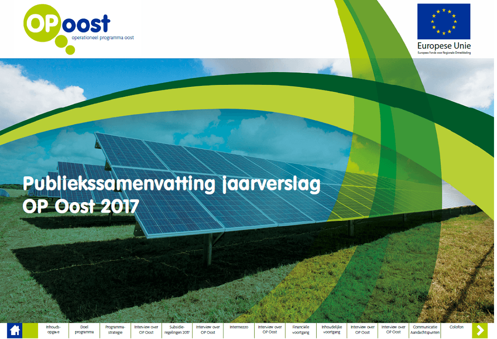 In het Operationeel Programma (OP) Oost werken Gelderland en Overijssel samen met de EU aan structurele versterking van de economie in Oost Nederland. De EU stelt hiervoor €101 miljoen beschikbaar. Het Rijk en de provincies Gelderland en Overijssel dragen samen €68 miljoen bij. OP Oost investeert in duurzame innovatie en stimuleert bedrijven om kennis om te zetten in nieuwe producten, processen of diensten. Bij het merendeel van de gesubsidieerde projecten, werken twee of meerdere bedrijven en kennisinstellingen samen. Door deze samenwerking, met soms verrassende partners, komt nieuwe techniek beschikbaar voor andere ondernemers en consumenten.