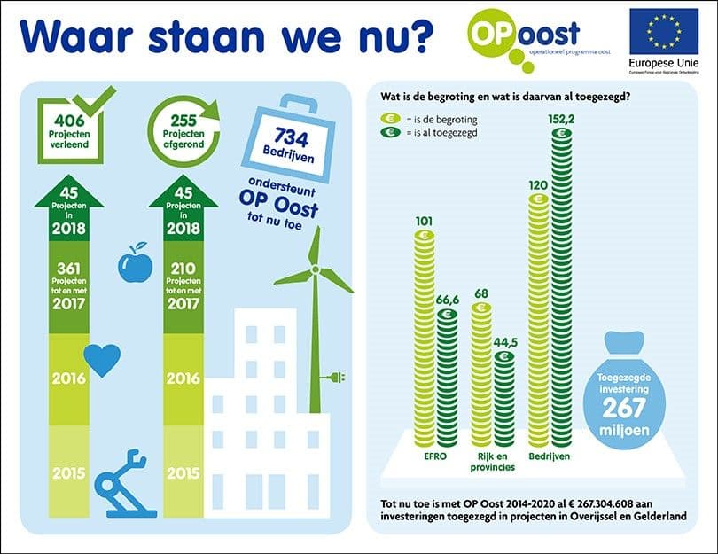 OP Oost subsidieert innovaties die een bijdrage leveren aan het oplossen van maatschappelijke uitdagingen en het versterken van de regionale economie. Hiervoor is 169 miljoen beschikbaar gesteld door Europa, het Rijk en de provincies Overijssel en Gelderland. Tot eind 2018 is van de beschikbare middelen € 111,1 miljoen toegekend. Samen met de bijdrage van mkb-ondernemers, grootbedrijven en kennisinstellingen betekent dit een totale impuls van € 267 miljoen voor de economie in de regio.