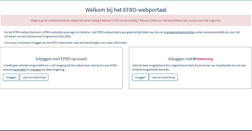 In verband met onderhoudswerkzaamheden is het het EFRO-webportaal vanaf vrijdag 17:00 tot en met zondag 7 februari 23:00 uur niet beschikbaar. Onze excuses voor het ongemak.